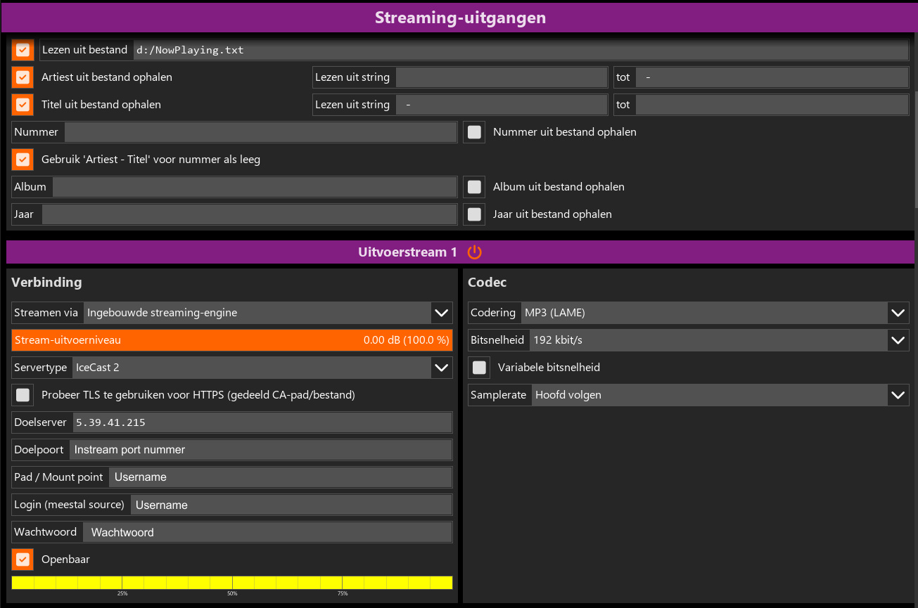 Wat opvalt is dat er bij icecast 2 een apart veld is voor de username en een eigen veld voor het wachtwoord. In tegenstelling van een shoutcast encoder waar username:wachtwoord gebruikelijk is. Ook moet er een mountpoint worden aangegeven die gelijk is aan de username (zonder hoofdletter mocht je die toch hebben ingesteld bij username) maar met een “/” er voor.